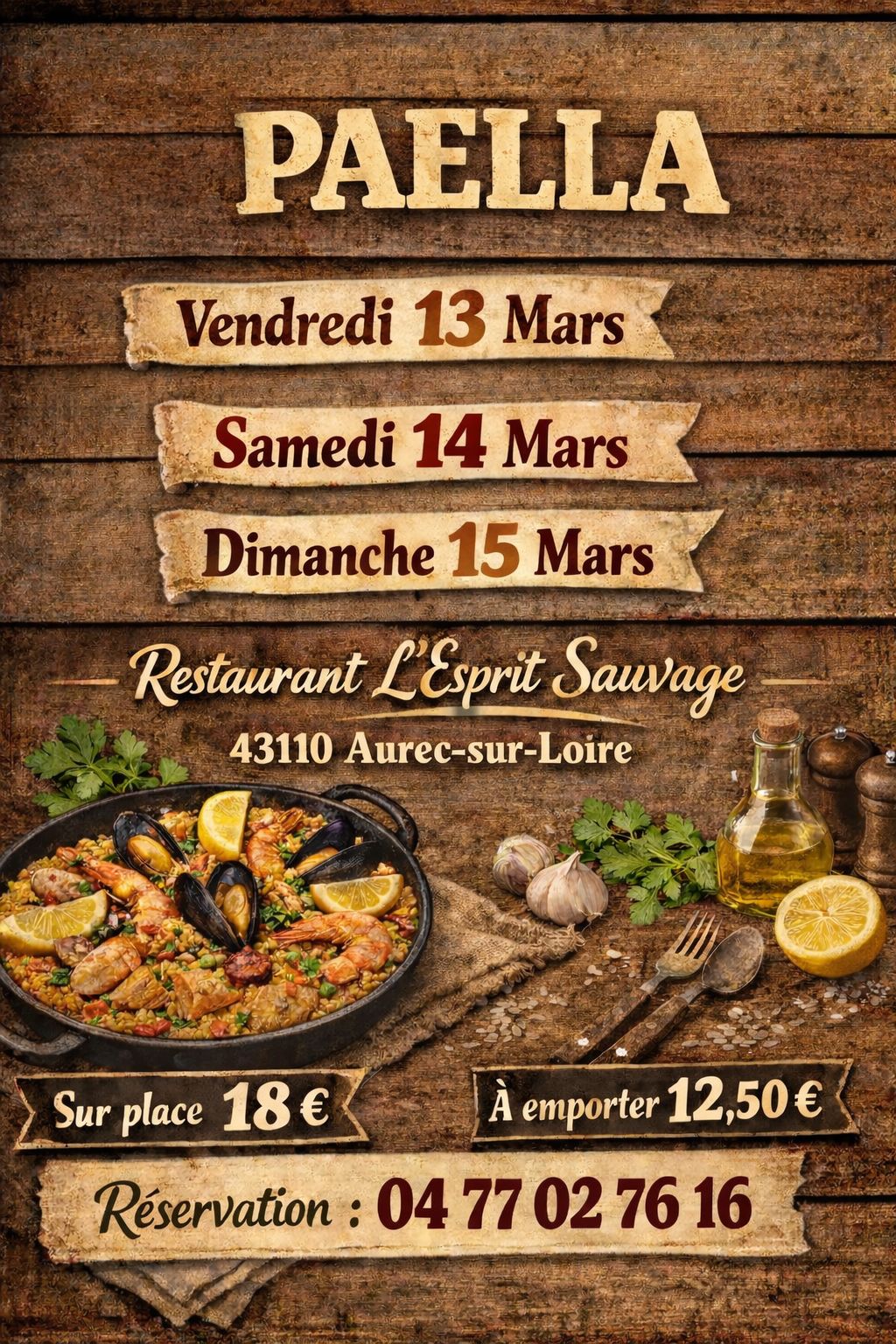 Détails de l'offre PAELLA Vendredi 13 Mars, Samedi 14 Mars, Dimanche 15 Mars. Restaurant : L'Esprit Sauvage, 43110 Aurec-sur-Loire. Prix et conditions Sur place : 18 €. À emporter : 12,50 €